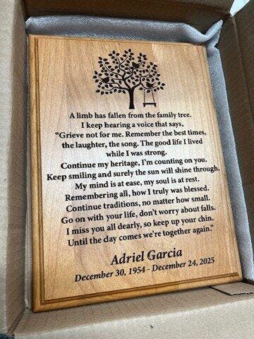 The “A Limb Has Fallen” personalized memorial plaque is a touching and elegant way to honor the memory of a loved one. This keepsake plaque features the cherished poem engraved with precision, and can be customized with a name and date to create a unique remembrance gift. Crafted to bring comfort and serve as a lasting tribute, it’s the perfect sympathy gesture for a grieving friend or a personal way to commemorate someone dear. This product is ideal for anyone who has experienced the loss of a loved one, whether purchased as a gift or for personal remembrance. It’s well suited for display in a home, office, or memorial space—offering a comforting presence and a way to keep their memory alive every day.